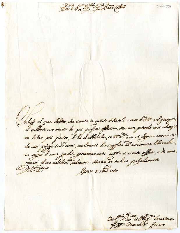 Lettera di Filippo Carlo vescovo di Pesaro al cardinale Annibale Albani (1718 dicembre 2)
