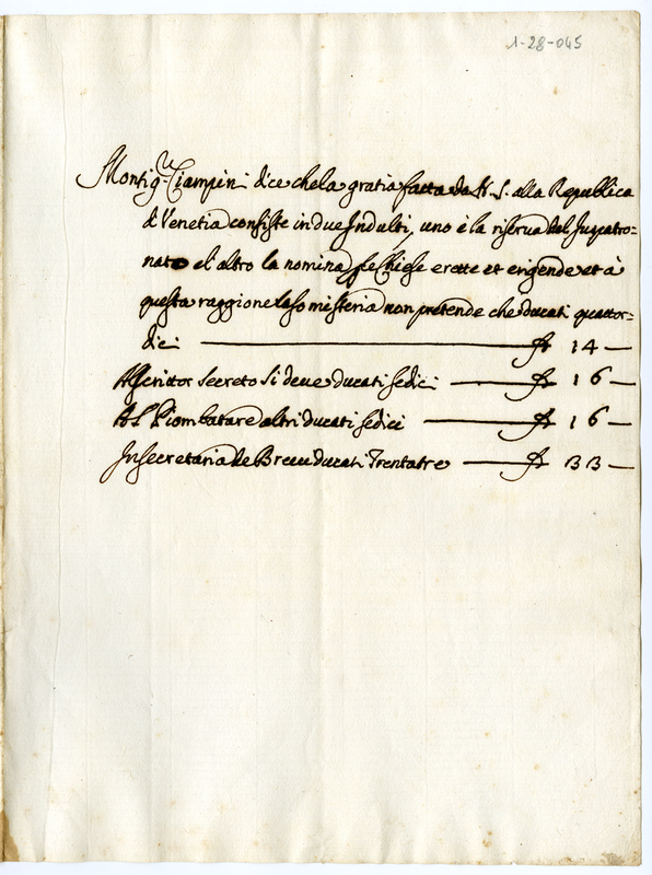 Nota di Monsignor Ciampini per la spedizione del Iuspatronato di Venezia e per la nomina relativamente eretta e da erigersi (1689-1700)