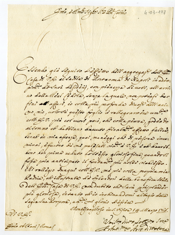 Lettera di Antonio Maria arcivescovo di Matera al Cardinale Annibale Albani (1716 marzo 14)