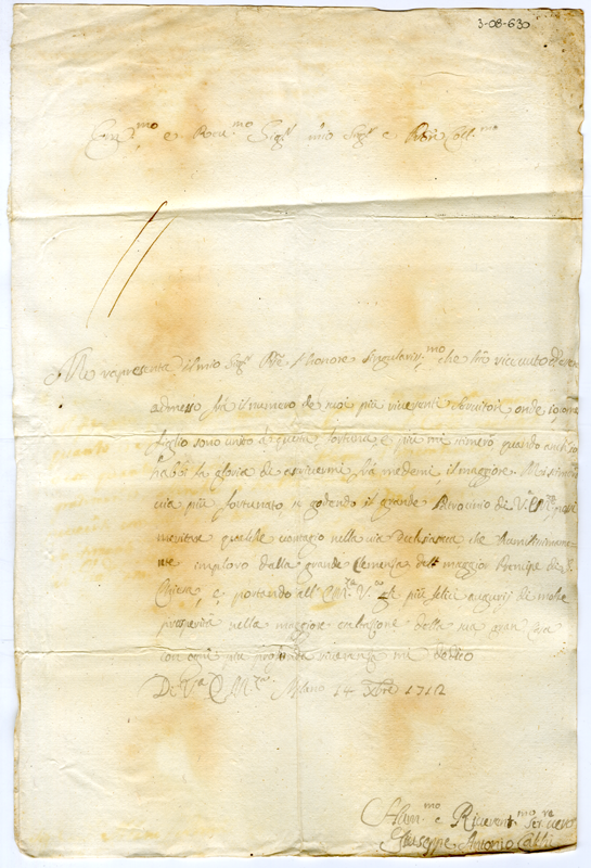 Lettera di Giuseppe Antonio Calchi al cardinale Annibale Albani (1712 dicembre 14)