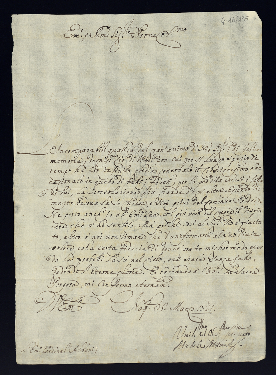 Lettere di condoglianza per la morte di Papa Clemente XI di gloriosa memoria