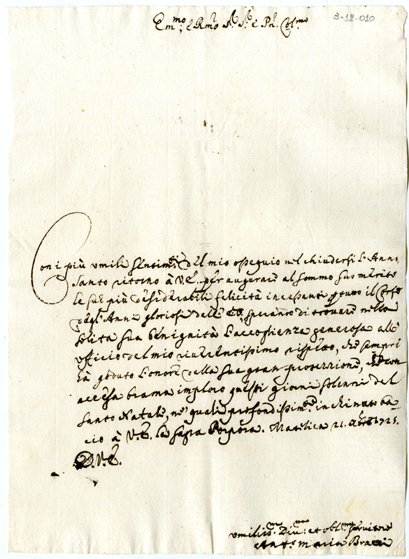 Lettera di Antonio Maria Bracci al cardinale Annibale Albani (1725 dicembre 21)