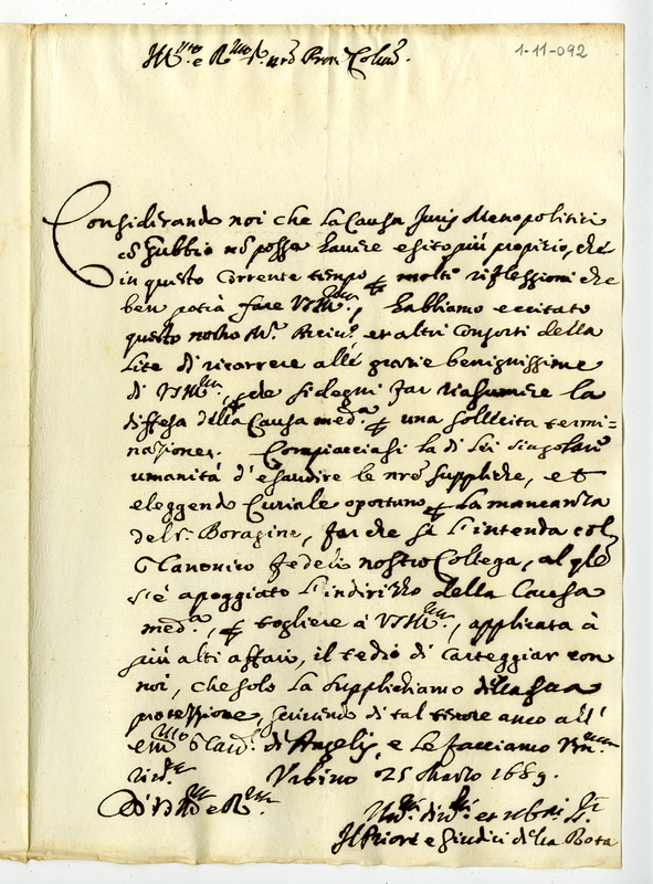 Lettera del priore e giudici della rota di Urbino a mons. Giovanni Francesco Albani (1689 marzo 25)