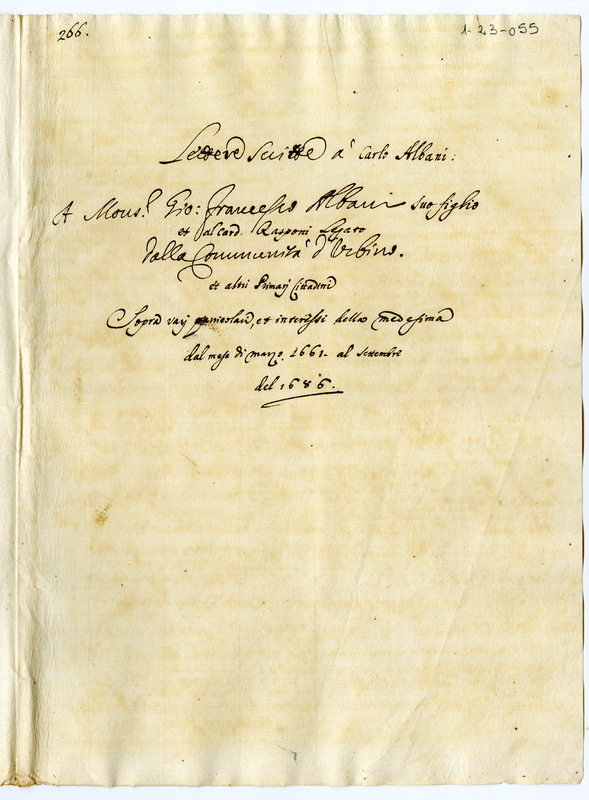 Lettere scritte a Carlo Albani a Monsignor Giovanni Francesco Albani suo figlio et al Cardinale Rasponi Legato dalla Comunità d'Urbino et altri Primari Cittadini Sopra vari particolari, et interessi della medesima dal mese di marzo 1661 al settembre del 1686