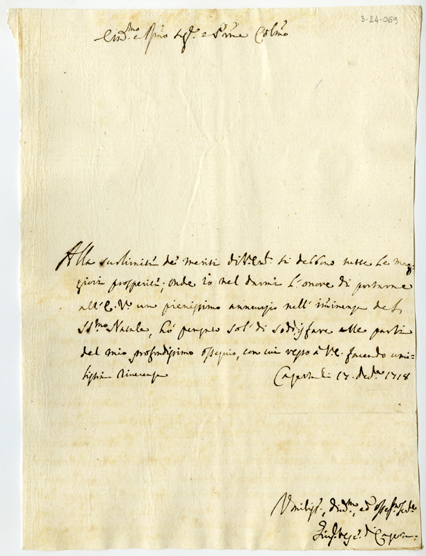 Lettera di Giuseppe vescovo di Caserta al cardinale Annibale Albani (1718 dicembre 17)