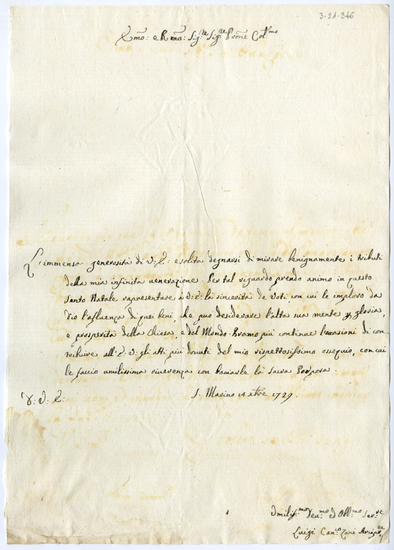 Lettera di Luigi Zani al cardinale Annibale Albani (1729 dicembre 14)