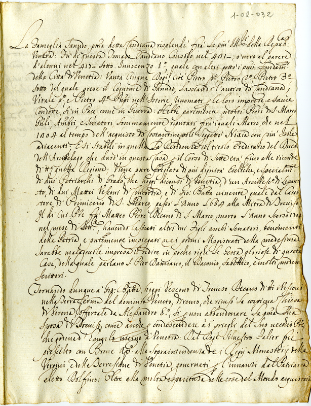 Nota di merito del vescovo di Treviso Giovanni Battista Sanudo.