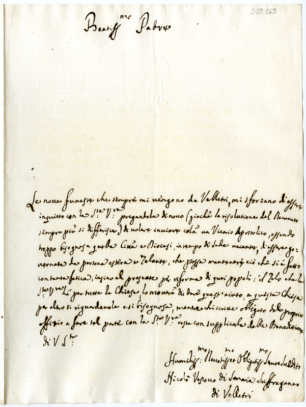 Lettera di Nicolò vescovo di Samaria suffraganeo di Velletri a Clemente XI (1700-1721)