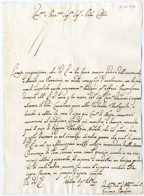 Lettera di Giacomo Pinzoni al Cardinale Annibale Albani (1715 febbraio 1)