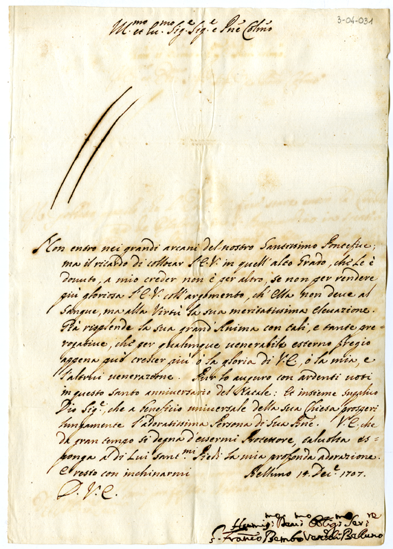 Lettera di Gianfrancesco Bembo vescovo di Belluno ad Annibale Albani (1707 dicembre 14)