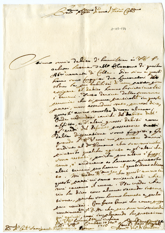 Lettera del vescovo Francesco Trevisan al cardinale Sacripante in merito alla fuga di alcuni coloni dall'Abbazia di Colle in Ceneda.