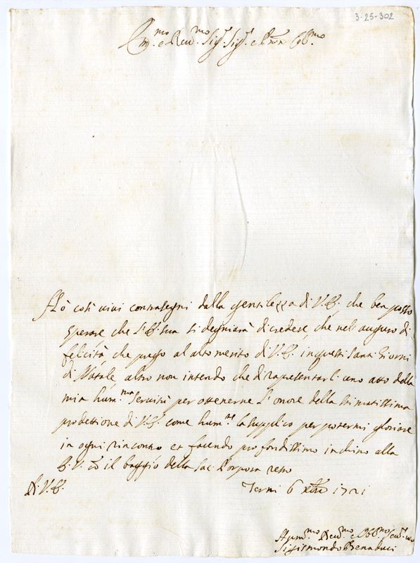Lettera di Sigismondo Benaduci al cardinale Annibale Albani (1721 dicembre 6)