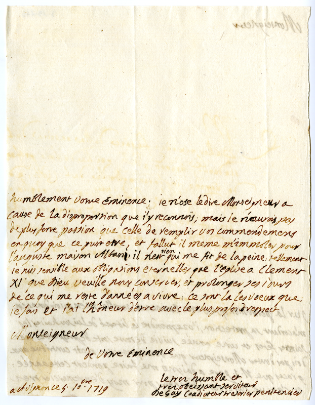 Lettera di Desay coadiutore, tesoriere e penitenziere ad Annibale Albani (1719 dicembre 5)