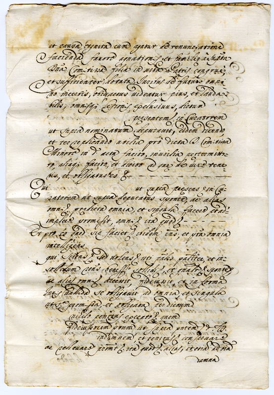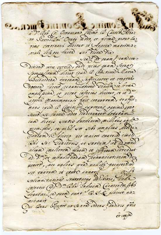 La supplica contiene la richiesta inoltrata al cardinale legato dal notaio in nome della contessa Maria Bernardina Ondedei di poter fare la rinuncia ai beni di famiglia non solo nella precedente formula ristretta ma anche in altra più ampia