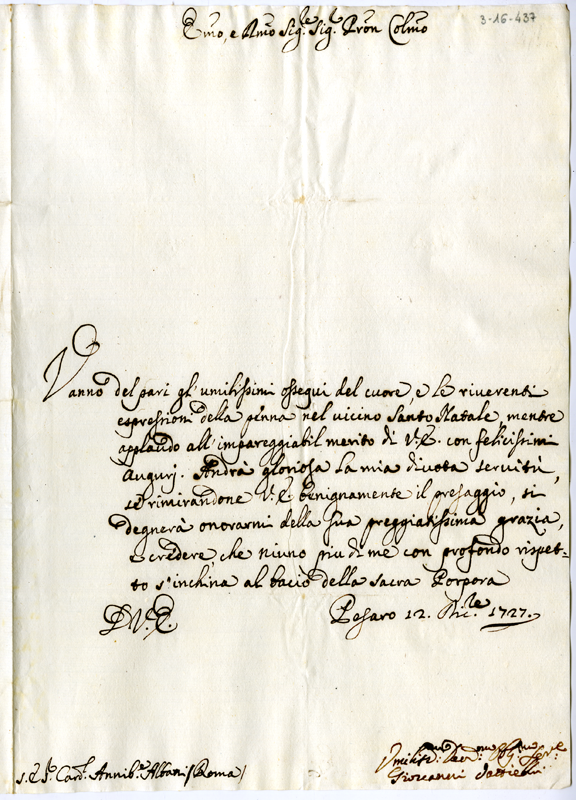 Lettera di Giovanni Vattielli al cardinale Annibale Albani (1727 dicembre 12)