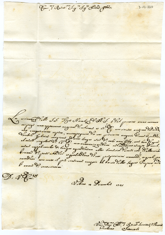 Lettera di Girolamo Staccoli al cardinale Annibale Albani (1725 dicembre 14)