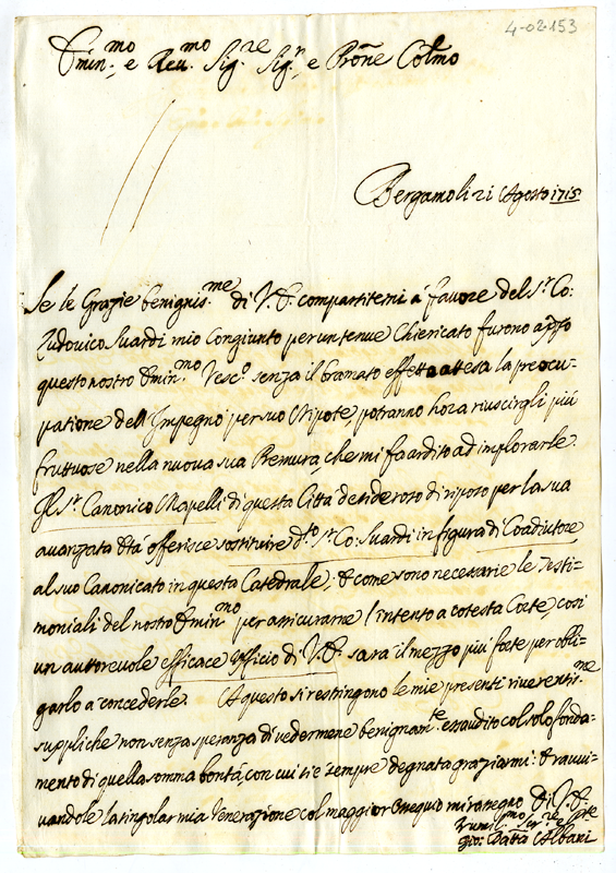 Chiede la coadiutoria ad un canonicato a favore del conte Suardi suo congiunto