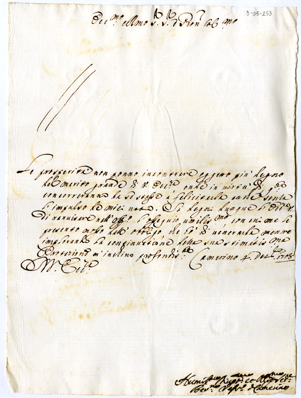 Lettera di Bernardino vescovo di Camerino ad Annibale Albani (1708 dicembre 4)