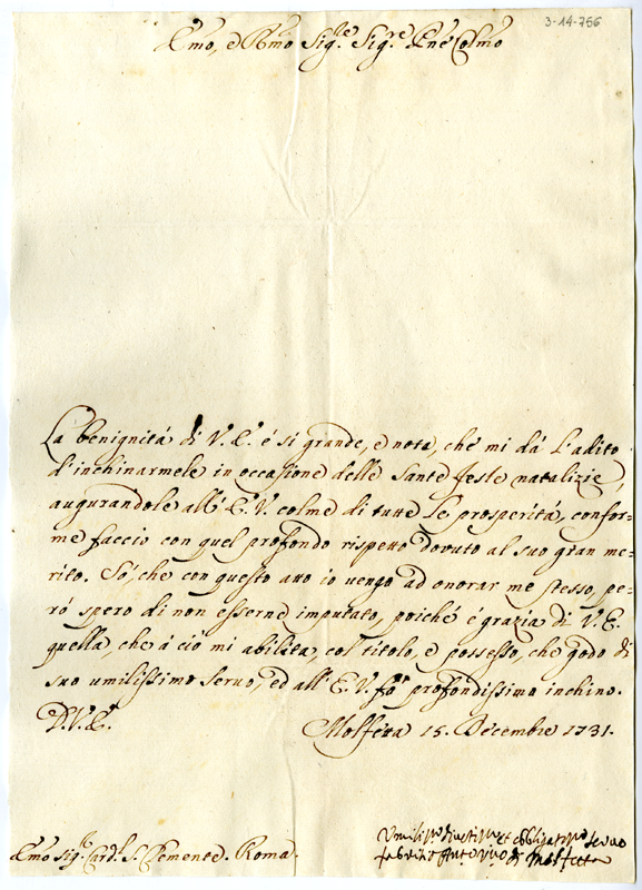 Lettera di Fabrizio Antonio vescovo di Molfetta al cardinale Annibale Albani (1731 dicembre 15)
