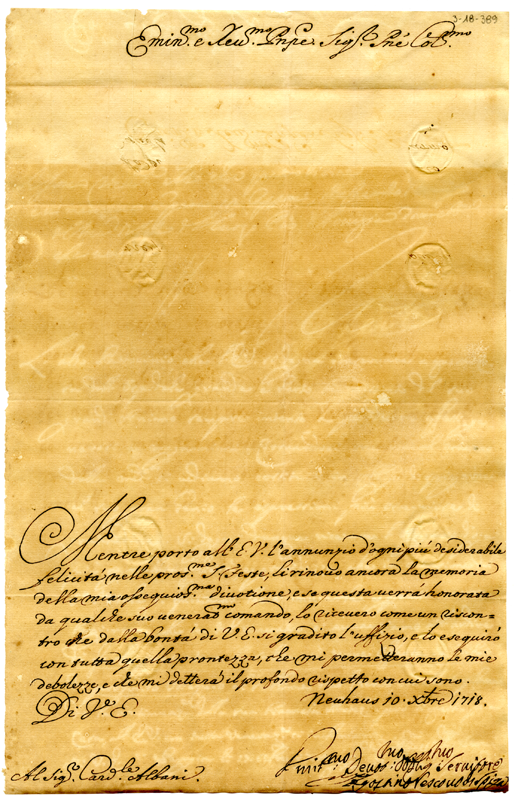 Lettera di Agostino vescovo di Spiga al cardinale Annibale Albani (1718 dicembre 10)
