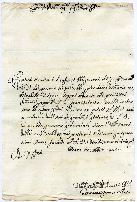 Lettera di Girolama Tomasi al cardinale Annibale Albani (1724 dicembre 17)