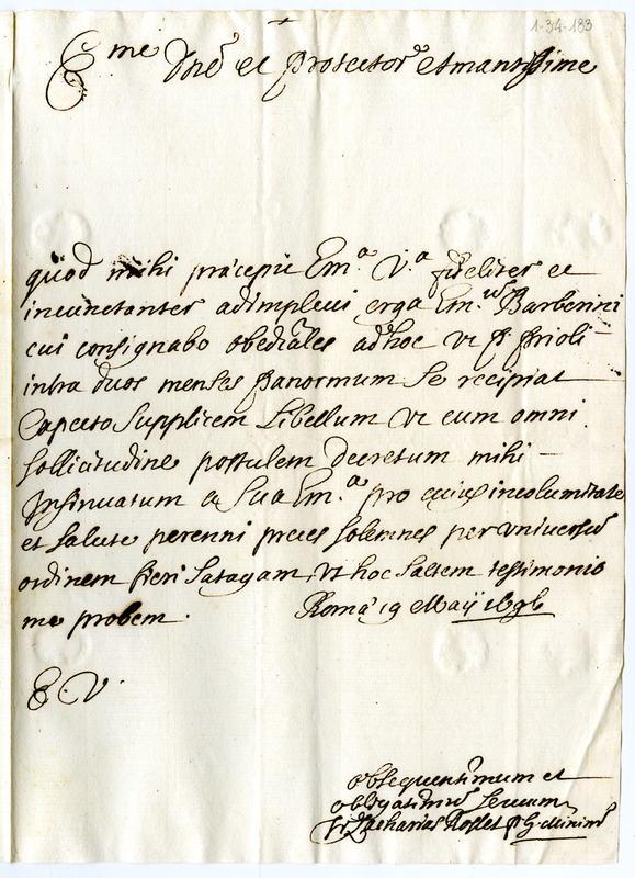 Lettera del generale dell'ordine dei minimi a Giovanni Francesco Albani (1696 maggio 19)