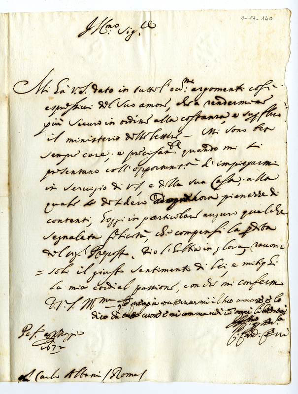 Lettera del cardinale Carlo Cerri a Carlo Albani (1672 maggio 8)