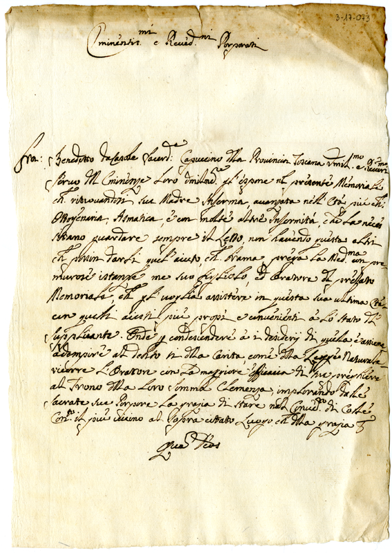 Lettera di fra Benedetto da Casole cappuccino della provincia Toscana a Eminentissi e Reverendissimi Porporati (1700-1721)