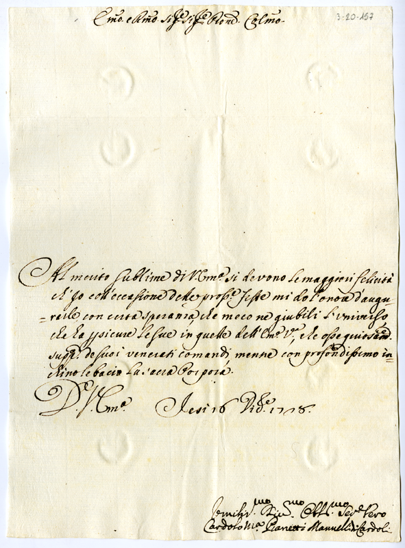 Lettera di Cardolo Maria Pianetti Mannelli Cardoli al cardinale Annibale Albani (1728 dicembre 16)