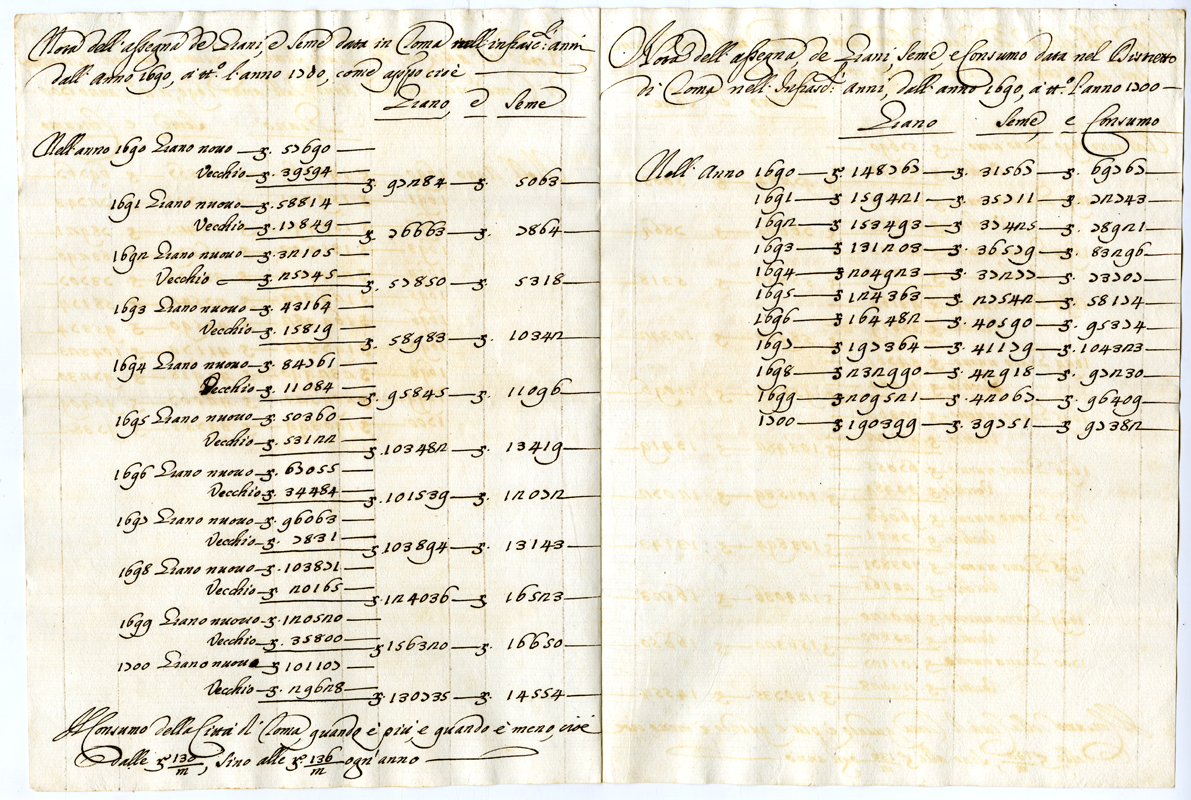 Nota dell'assegnamento dei grani, semi e consumo nel distretto di Roma negli anni 1690 1700
