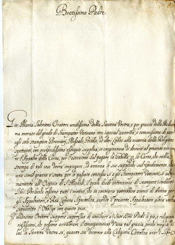 | dc.description | Giovanni Maria Salvioni stampatore Vaticano chiede l'esenzione al pagamento della gabella sulla carta | |