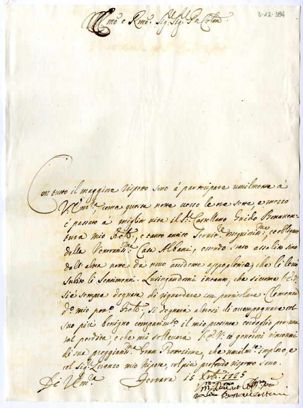 Lettera di Fabio Bonaventura al cardinale Annibale Albani (1725 dicembre 15)