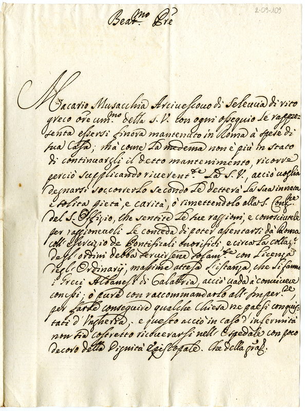 Lettera di Macario Musacchia arcivescovo di Seleucia a Clemente XI (1700-1721)