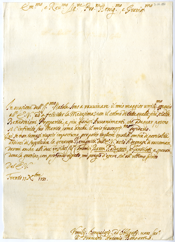 Lettera di don Francesco Antonio Bonporti al cardinale Annibale Albani (1731 dicembre 11)