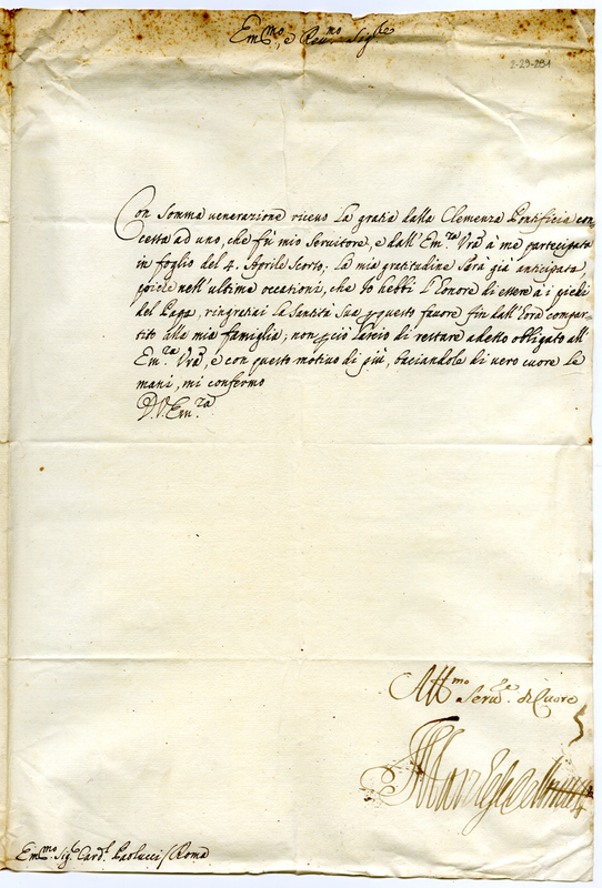 Ringrazia il cardinale per avere sistemato un suo ex servitore