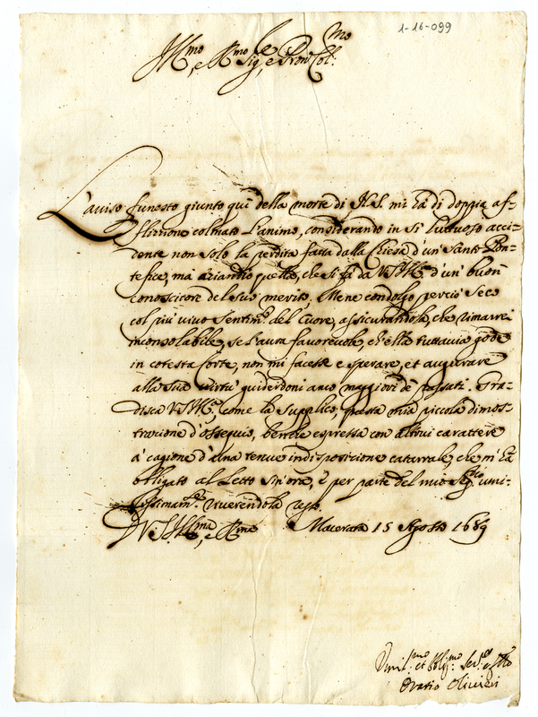 Lettera di Orazio Olivieri degli Abbati a Giovanni Francesco Albani (1689 agosto 15)