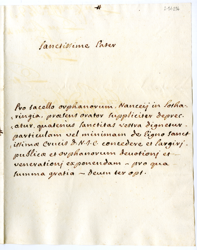 Chiede di potere avere dal pontefice una reliquia del legno della croce di Cristo per il collegio degli orfani di Nancy e per la pubblica venerazione
