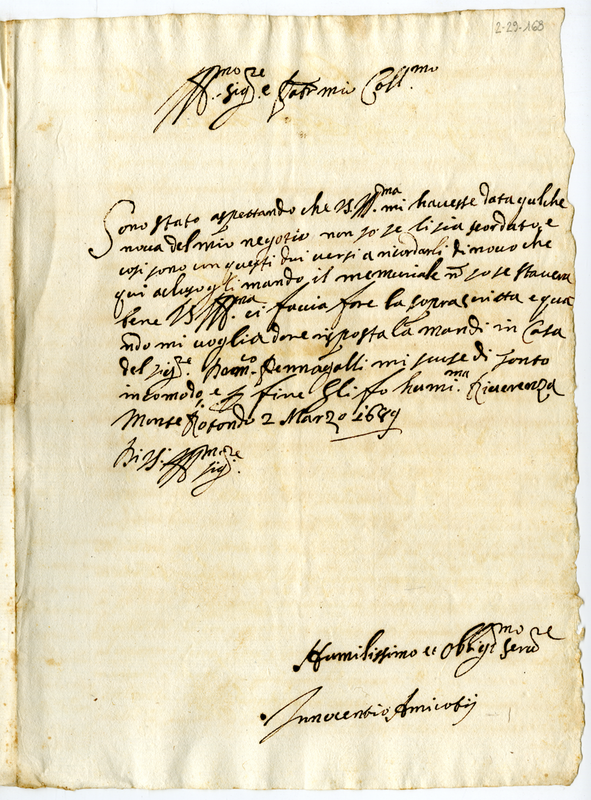 Lettera di Innocenzo Amicoti (1689 marzo 2)
