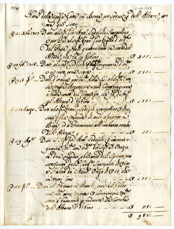 Nota delle spese fatte in Roma per servizio dell'altare come qui sotto (1707-1708)