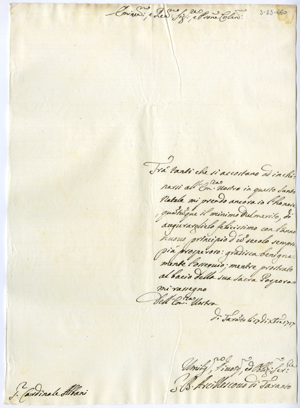 Lettera di Giovanni Battista arcivescovo di Taranto al cardinale Annibale Albani (1717 dicembre 17)
