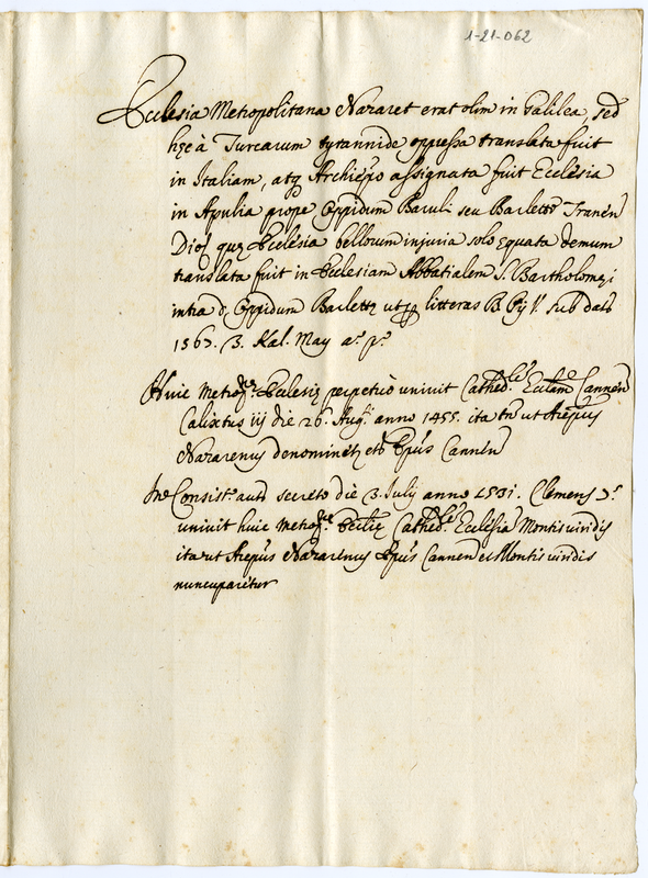 Memoria storica della chiesa metropolitana di Nazaret in Italia (1700-1721)