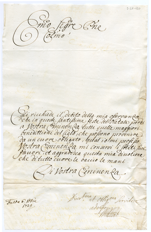 Lettera di Adolfo al cardinale Annibale Albani (1729 dicembre 6)