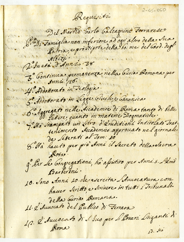 Requisiti del Marchese Carlo Calcagnini Ferrarese (1700-1721)