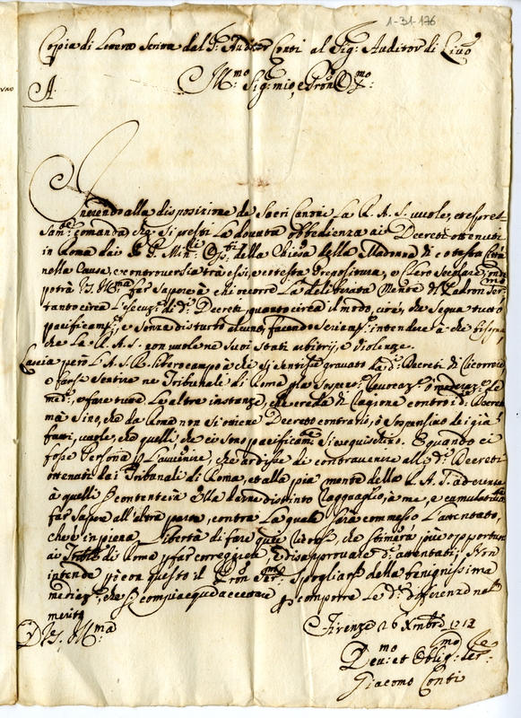 Archivio Albani|"Scritture spettanti alli frati dell'ordine de minori Conventuali, Osservanti, Riformati, Capuccini"|"1715 Livorno Lettere, e altre scritture appartenenti alle differenze vestenti tra li Frati Minori Osservanti di San Francesco di Santa Maria di Livorno, e il Proposto di quella Collegiata"|Documenti contenuti
