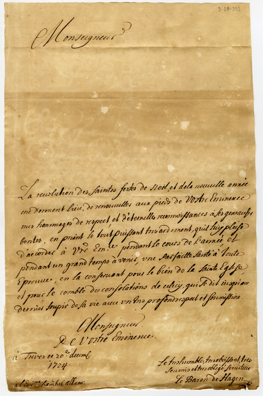 Lettera del barone di Hagen al cardinale Annibale Albani (1724 dicembre 20)
