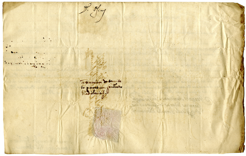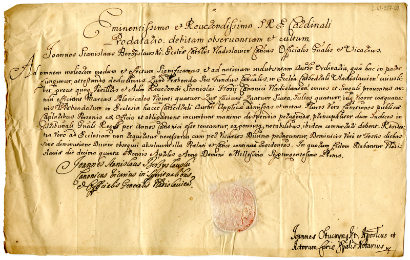 Attestato di Giovanni Stanislao Borzystarvski rilasciato al cardinale prodatario sulle rendite del canonicato della chiesa cattedrale di Vladislavia (1701 aprile 15)