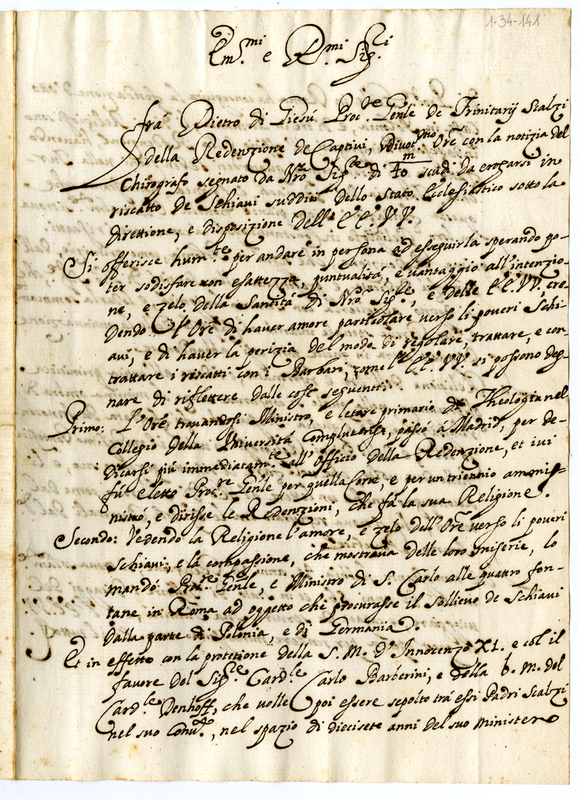 Lettera di Pietro di Gesù Generale dei trinitari scalzi del riscatto ai cardinali esecutori del riscatto ordinato dal pontefice (1700-1721)