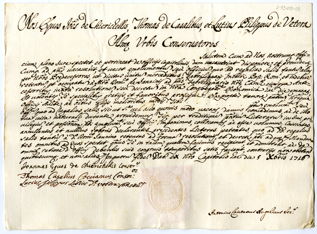 Modello di concessione privo di nominativo di un ufficio capitolino vacante (1716 dicembre 5)