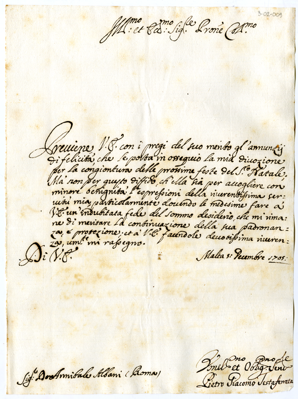 Lettera di Pietro Giacomo Testaferrata ad Annibale Albani (1705 dicembre 5)