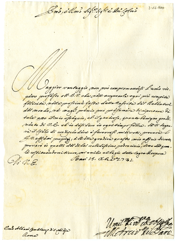 Lettera dell'arcivescovo di Bari al cardinale Annibale Albani (1731 dicembre 15)